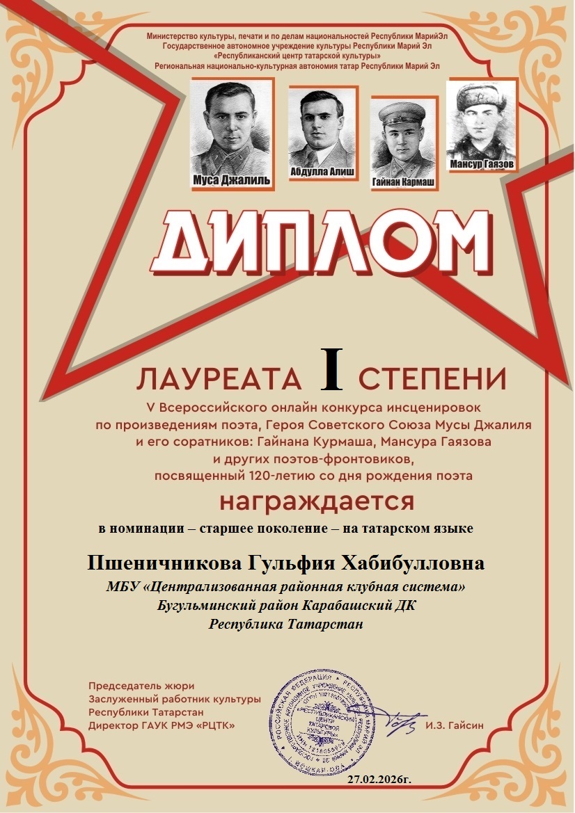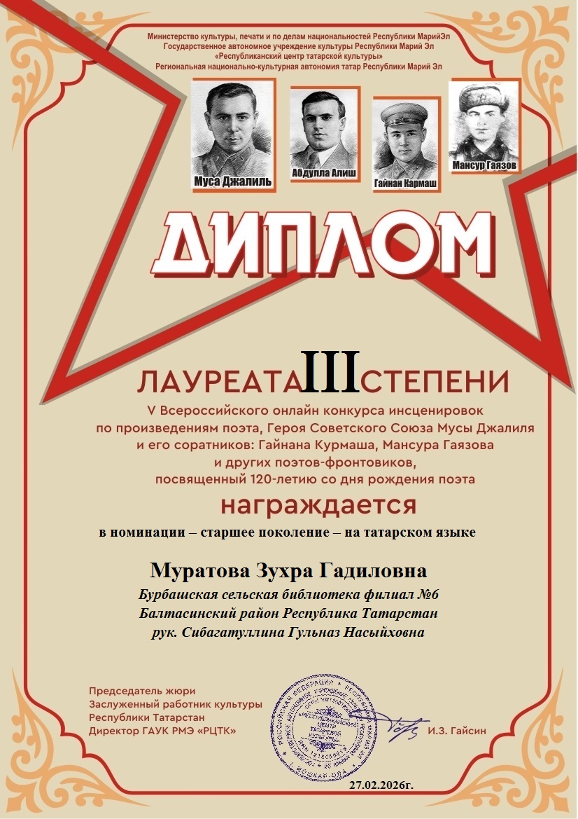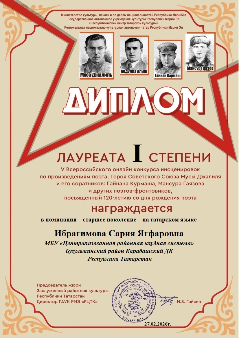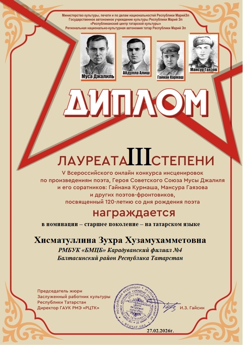 Фев 27 Итоги V Всероссийского онлайн-конкурса инсценировок по произведениям поэта Героя Советского Союза Мусы Джалиля и его соратников(Гайнана Курмаша, Мансура Гаязова и других поэтов-фронтовиков) — старшее поколение — на татарском и русском языках | Культурные события, Мероприятия, Постоянные новости., Татарский центр, Татары Марий Эл Дорогие наши участники! Поздравляем вас и желаем крепкого здоровья и дальнейших творческих успехов!