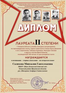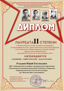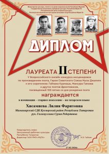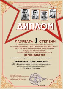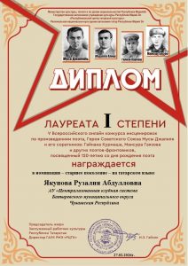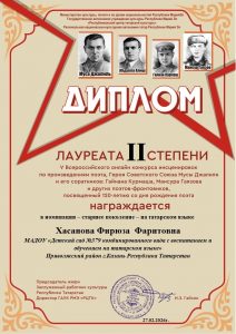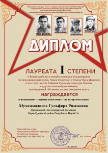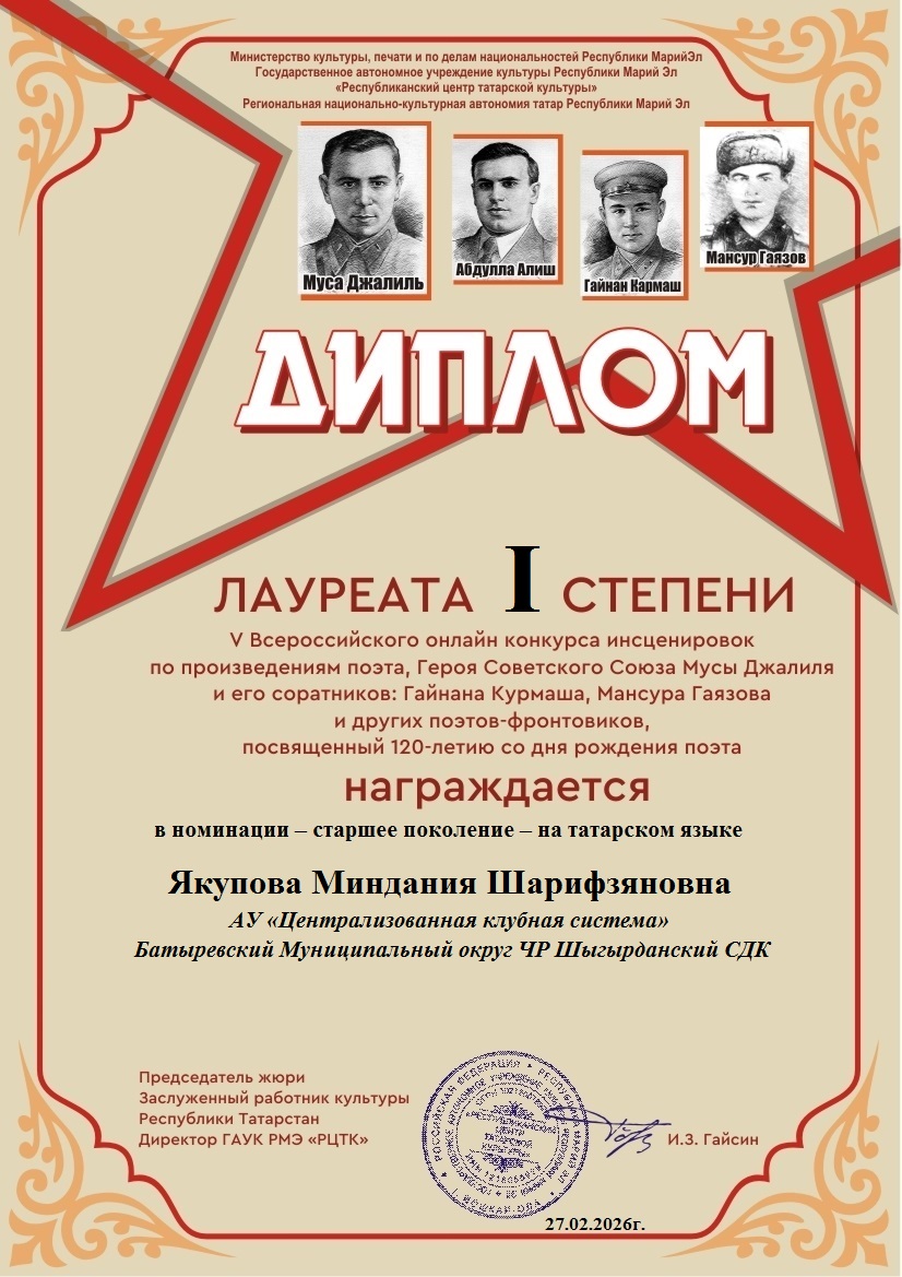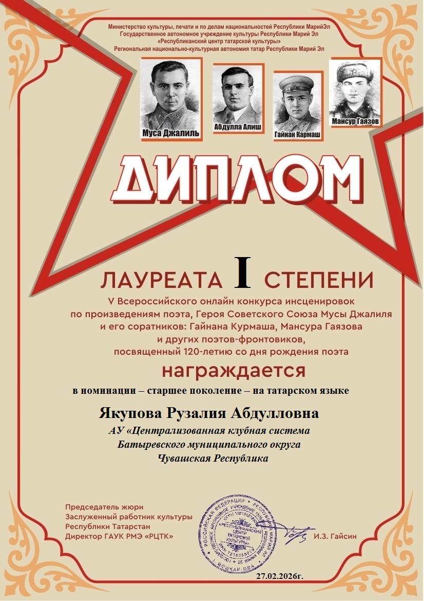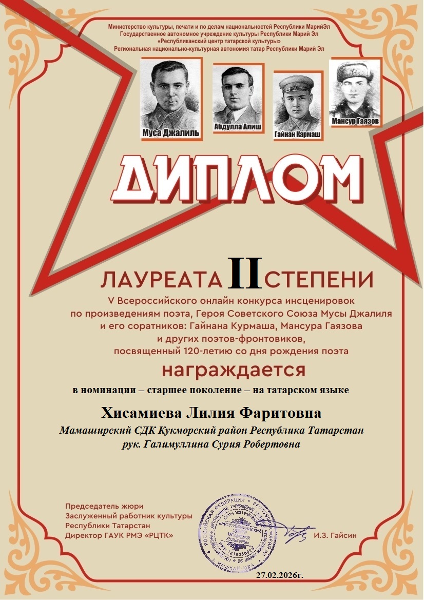 Фев 27 Итоги V Всероссийского онлайн-конкурса инсценировок по произведениям поэта Героя Советского Союза Мусы Джалиля и его соратников(Гайнана Курмаша, Мансура Гаязова и других поэтов-фронтовиков) — старшее поколение — на татарском и русском языках | Культурные события, Мероприятия, Постоянные новости., Татарский центр, Татары Марий Эл Дорогие наши участники! Поздравляем вас и желаем крепкого здоровья и дальнейших творческих успехов!
